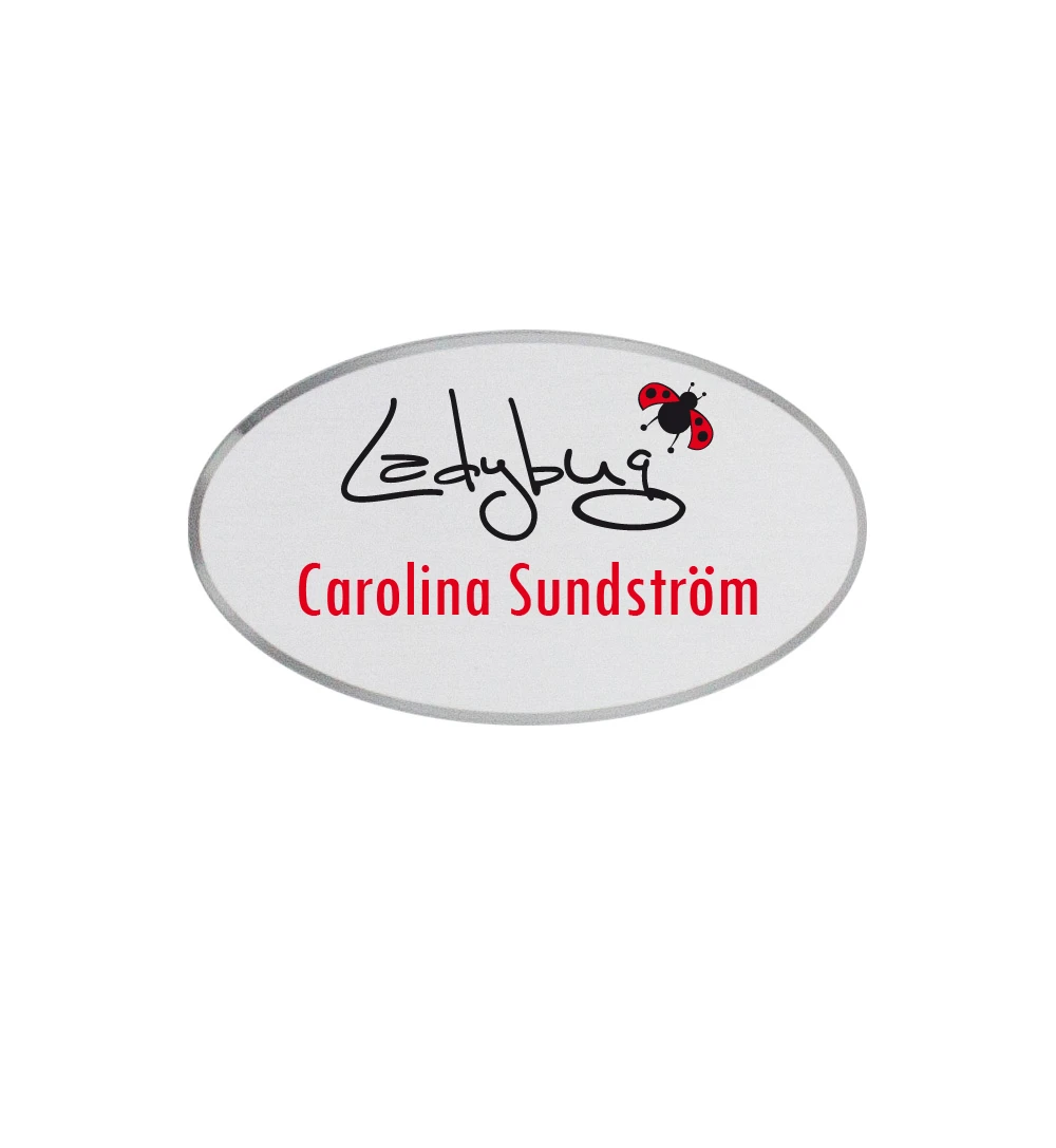 Paris är en oval namnbricka i storlek 34x59mm. Brickan är tillverkad i stilren aluminium och finns i färgerna guld, silver och svart med fasade kanter.